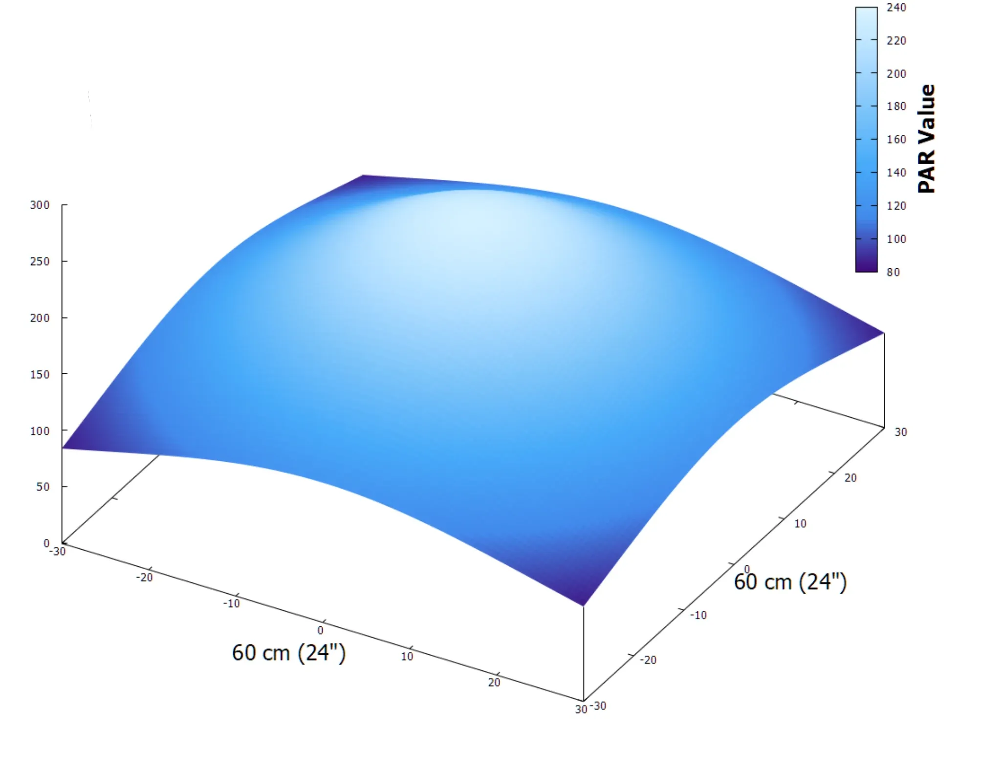 MJ-L 260 PAR value chart of seawater lamp system, distance between lamp and test point: 16”/40cm - 32"/80cm Data Analysis is shown in the figure