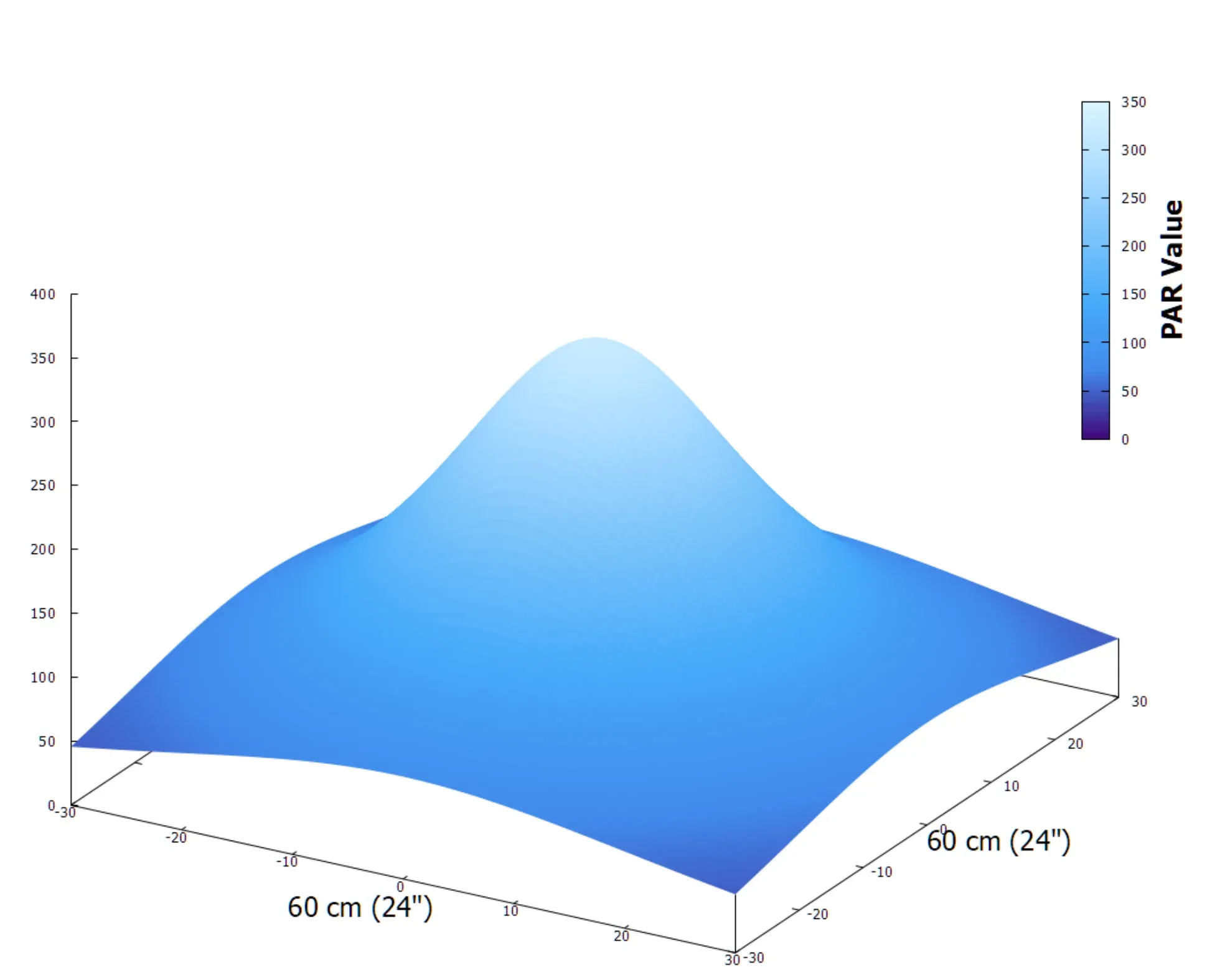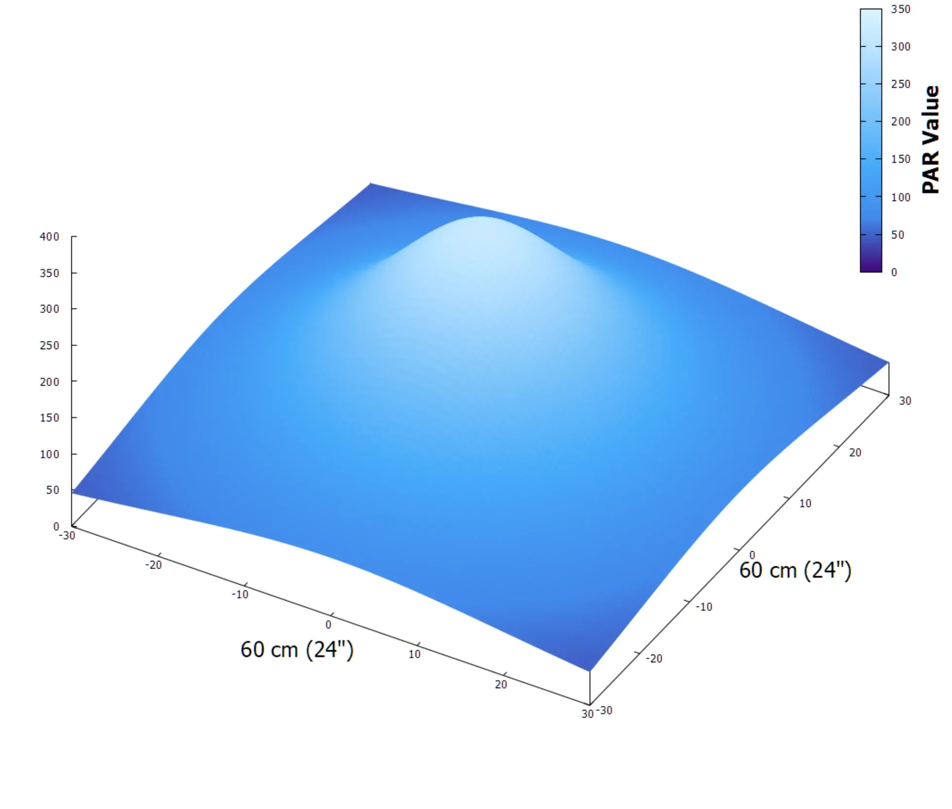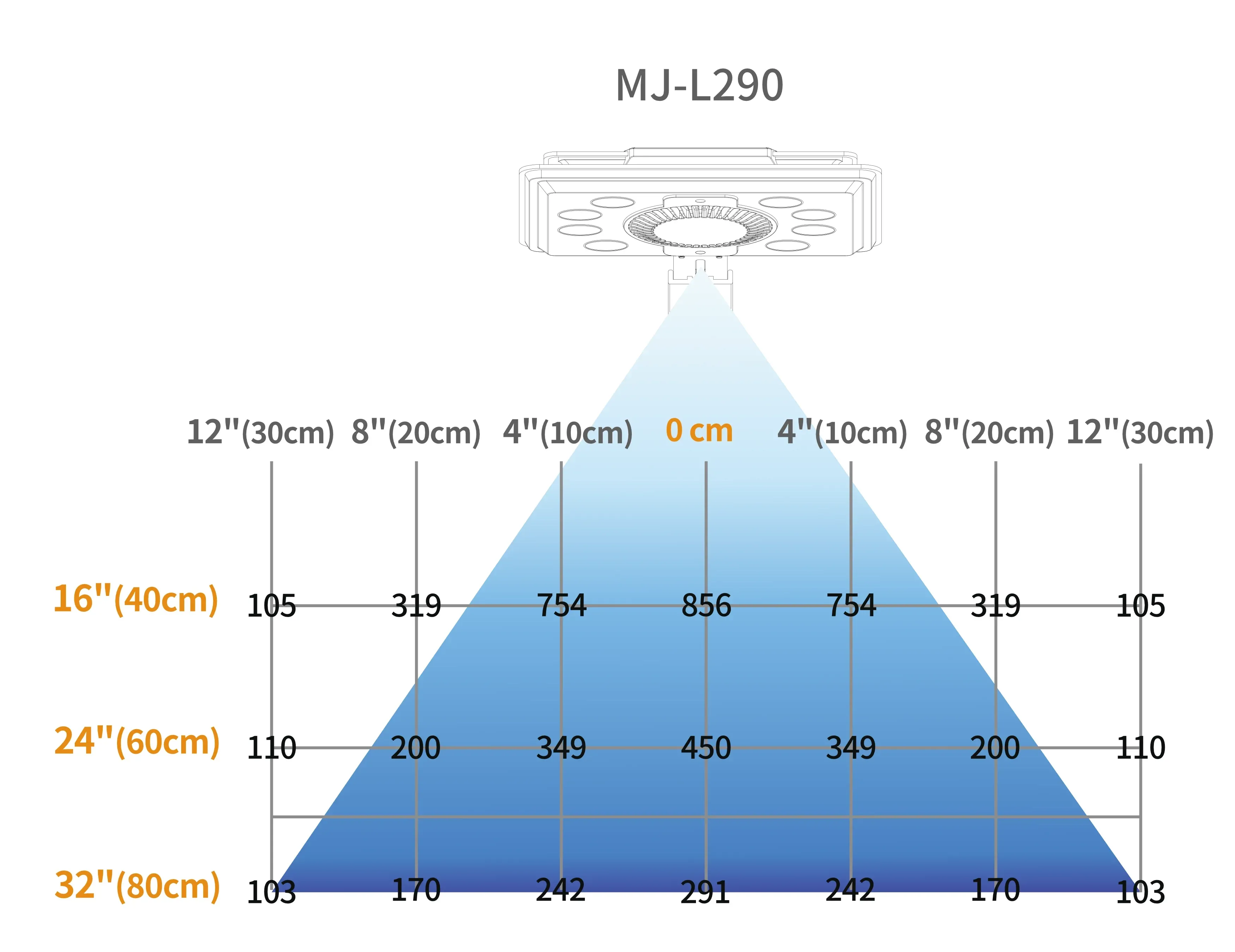 MJ-L 290 PAR value chart of seawater lamp system, distance between lamp and test point: 16”/40cm - 32"/80cm Data Analysis as shown in the figure