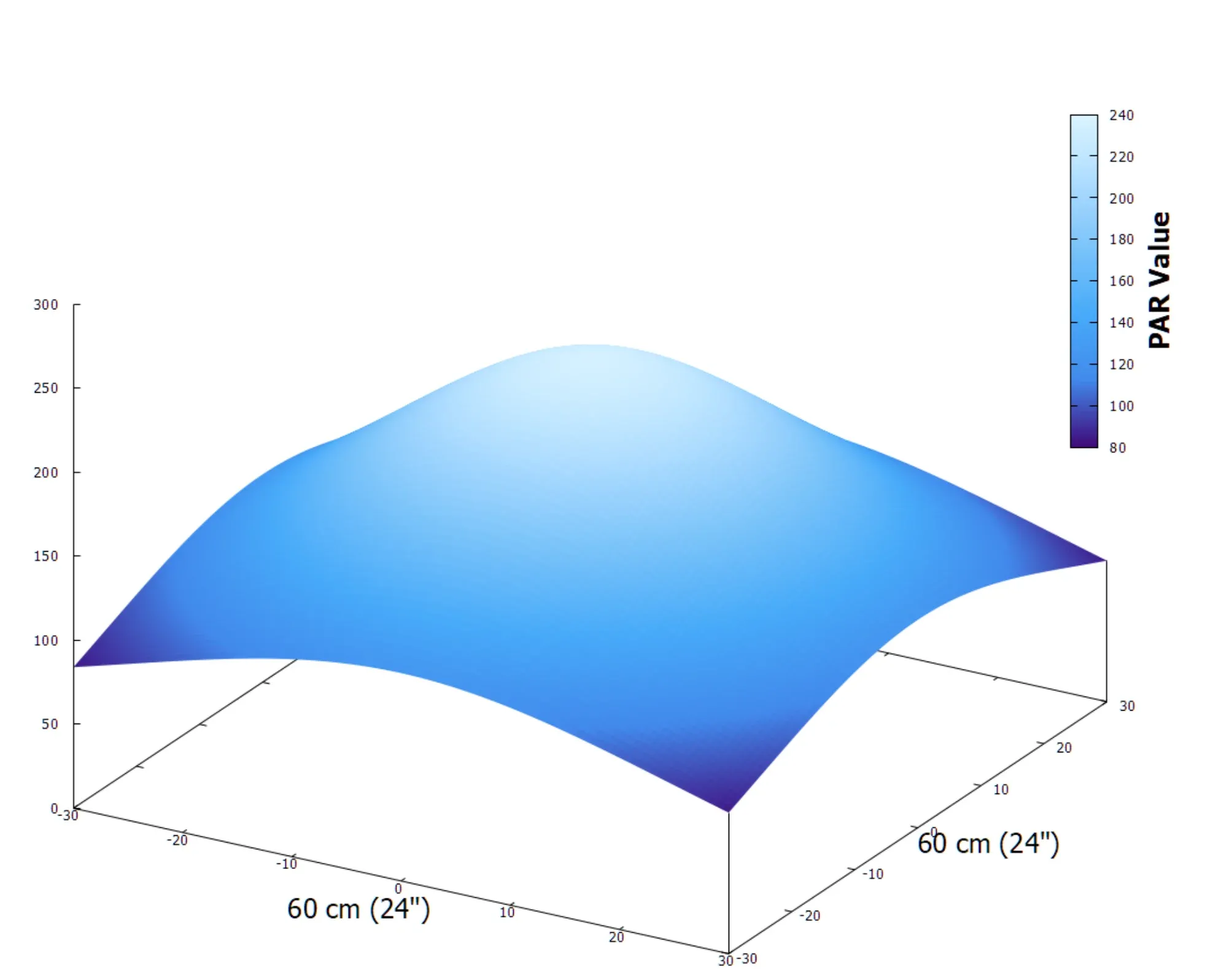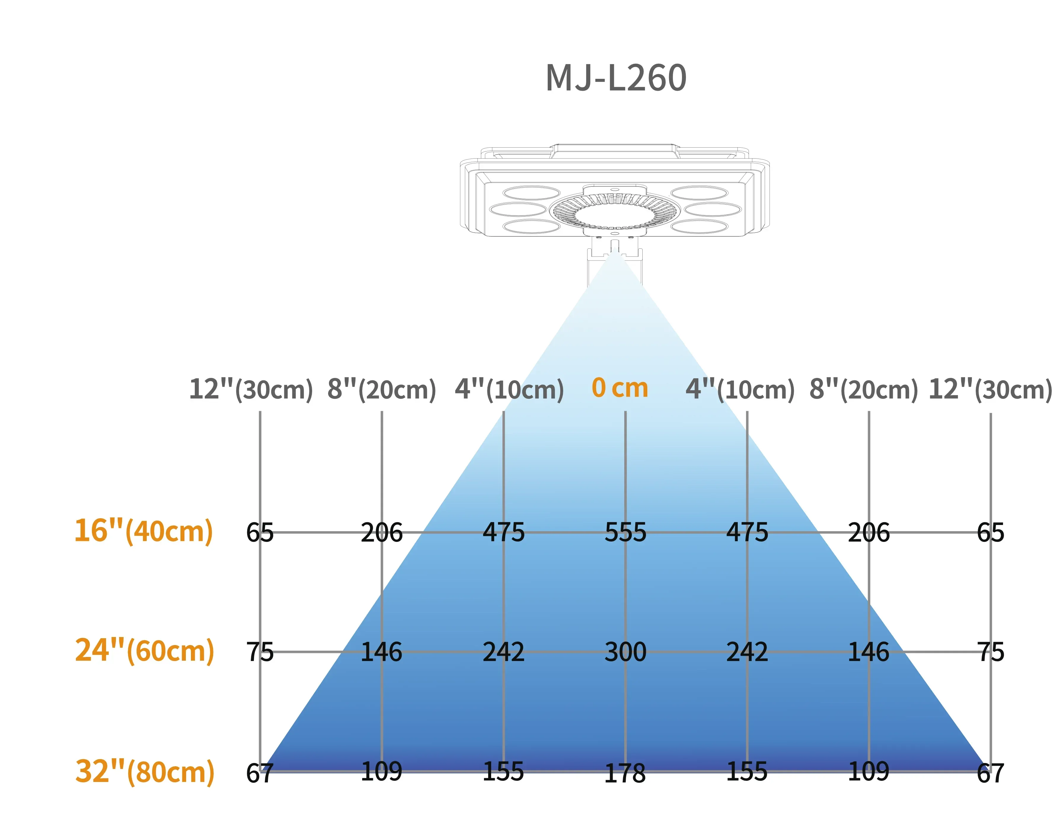 MJ-L 260 PAR value chart of seawater lamp system, distance between lamp and test point: 16”/40cm - 32"/80cm Data Analysis is shown in the figure